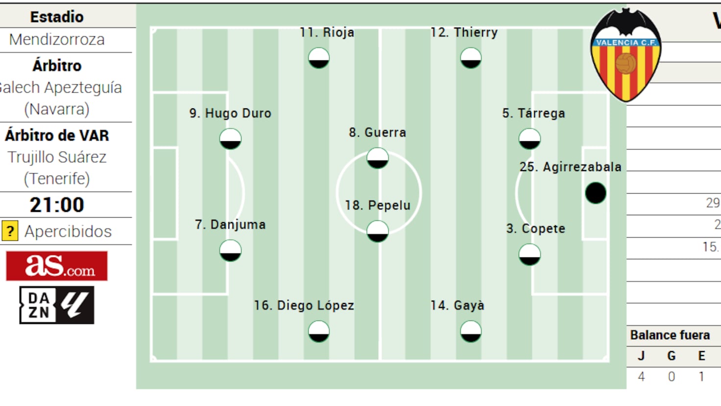 En el frente de ataque, se espera que Rioja y Diego López ocupen las bandas, con Danjuma y Hugo Duro formando la dupla ofensiva. Sin embargo, Corberán ha estado experimentando con una variante que incluye a Raba, lo que podría cambiar la configuración ofensiva del equipo. Si Raba entra en el once inicial, uno de los delanteros, ya sea Diego López o Hugo Duro, podría comenzar en el banquillo. En tal caso, Danjuma se desplazaría a la banda, Raba actuaría como enlace y Hugo Duro sería la referencia en ataque.